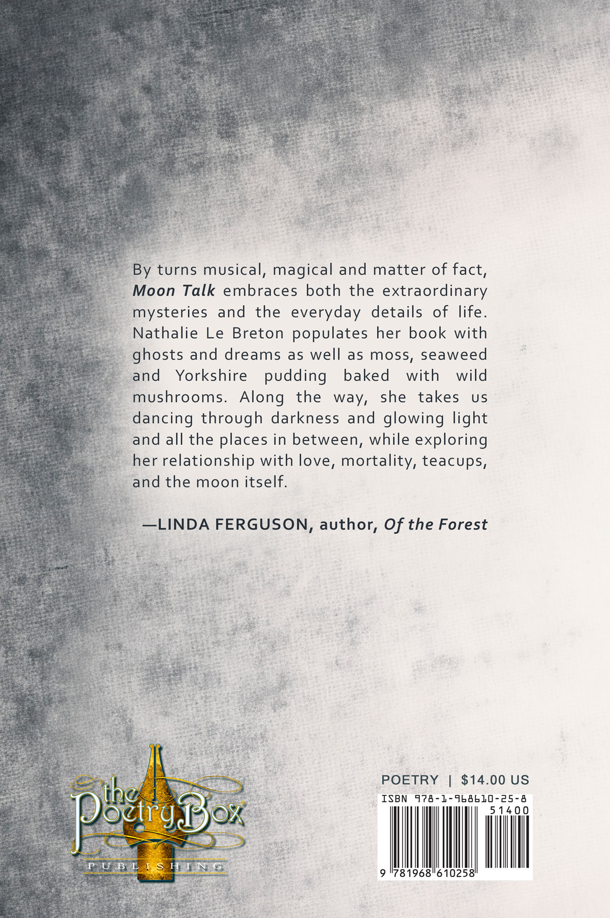 By turns musical, magical and matter of fact, Moon Talk embraces both the extraordinary mysteries and the everyday details of life. Nathalie Le Breton populates her book with ghosts and dreams as well as moss, seaweed and Yorkshire pudding baked with wild mushrooms. Along the way, she takes us dancing through darkness and glowing light and all the places in between, while exploring her relationship with love, mortality, teacups, and the moon itself.