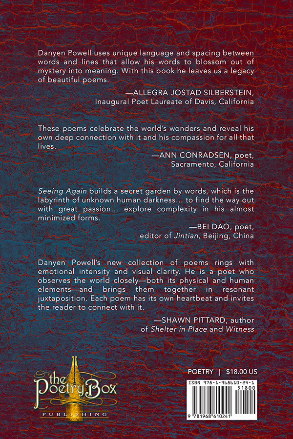 Danyen Powell in “Seeing Again” uses unique language and spacing between words and lines that allow his words to blossom out of mystery into meaning. As in his poem “Inside The Grey Barn” shadows turn the great key of silence. And in the title-poem, “Seeing Again” there’s the undeniable songbird pierces countless veils. In his penultimate poem, “We Were Always Hungry” he says that through plagues and wars we longed for our legacy to be more—than a stone mouth unable to tell its story. With this book he leaves us a legacy of beautiful poems.