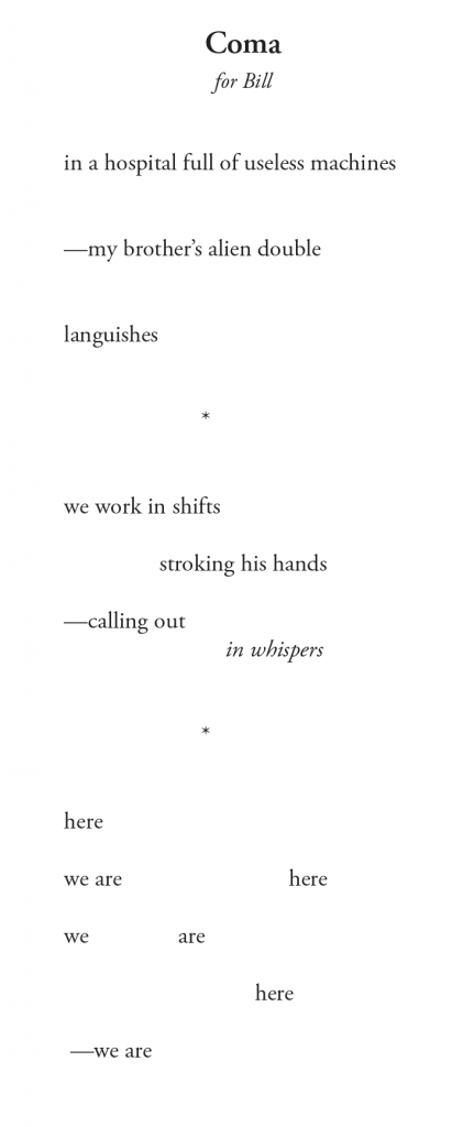 Powell’s vision is accessible in each poem, but none insists on a singular understanding. His familiar word choices and subjects—Nature and neighborhoods, mourning and mornings, every form of light–contribute to this sense of openness. Also, his use of white space on the page may be the most significant feature that welcomes readers to investigate the possibilities in each word, each line break, each stanza, and to engage with the resonances and contradictions they find in these pages and in their own lives.